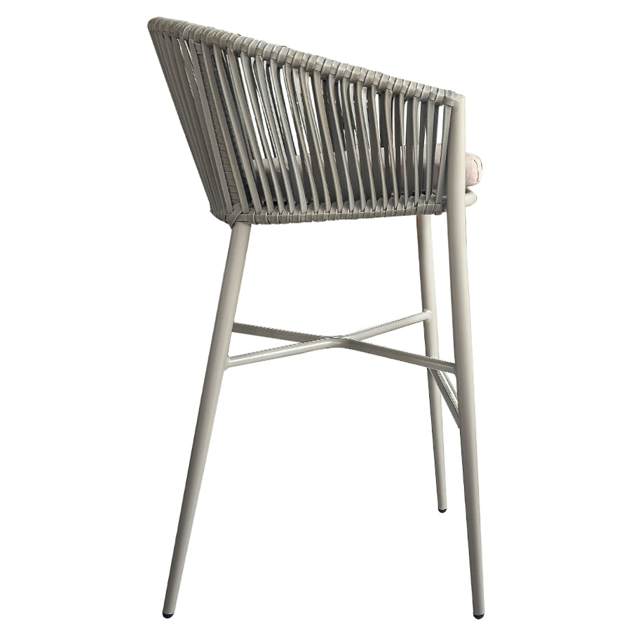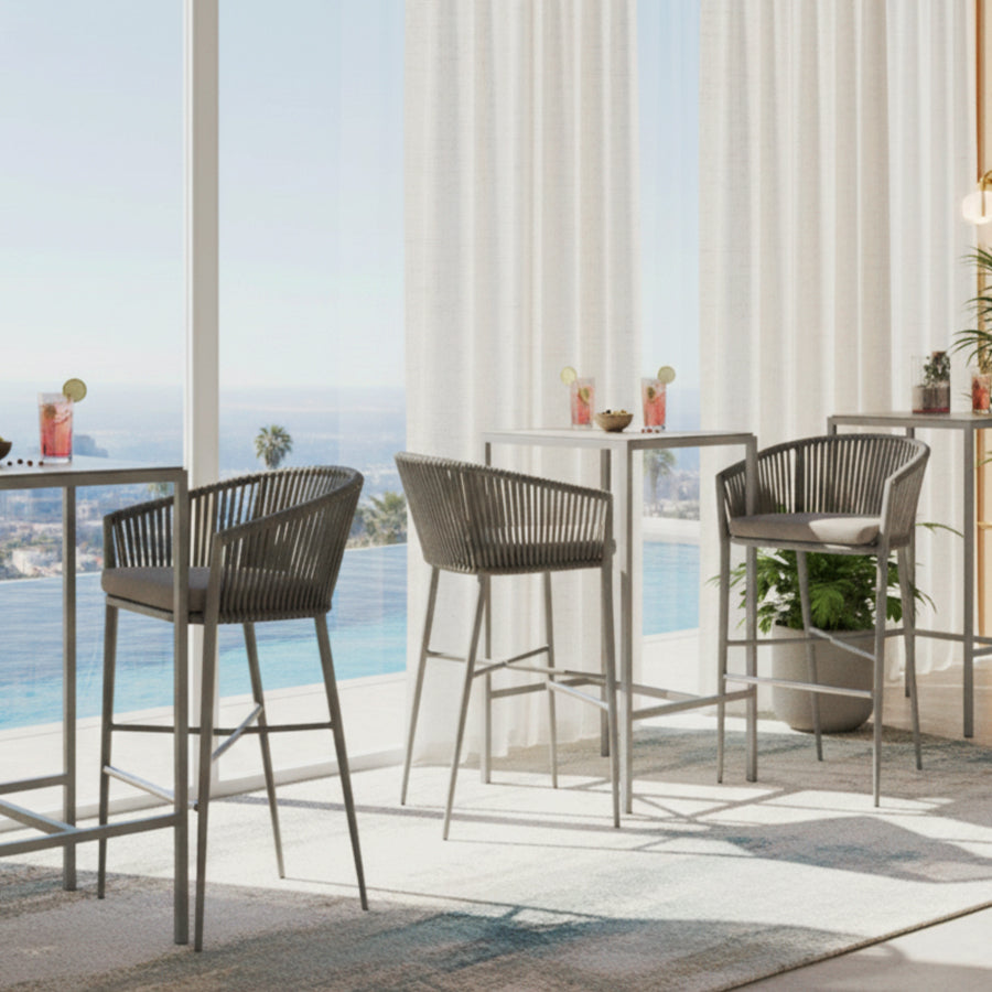 Fabricado en aluminio con pintura electrostática color gris, asiento con cojín de espuma hecho con tela acrílica tipo sunbrella color gris. Tejido a mano de polietileno color gris.