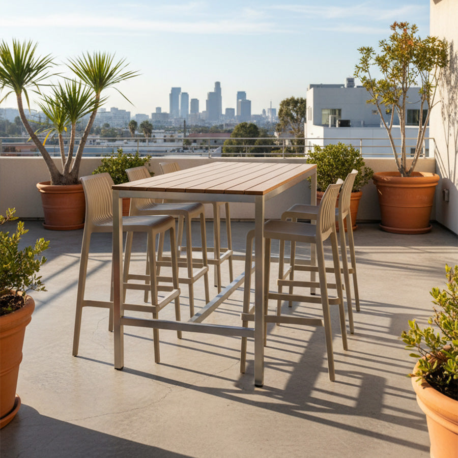 Banco de una sola pieza con diseño ergonómico, ideal para interior y exterior. Resistente a rayos UV y al ambiente salino, con descansa pies sólido de acero inoxidable.