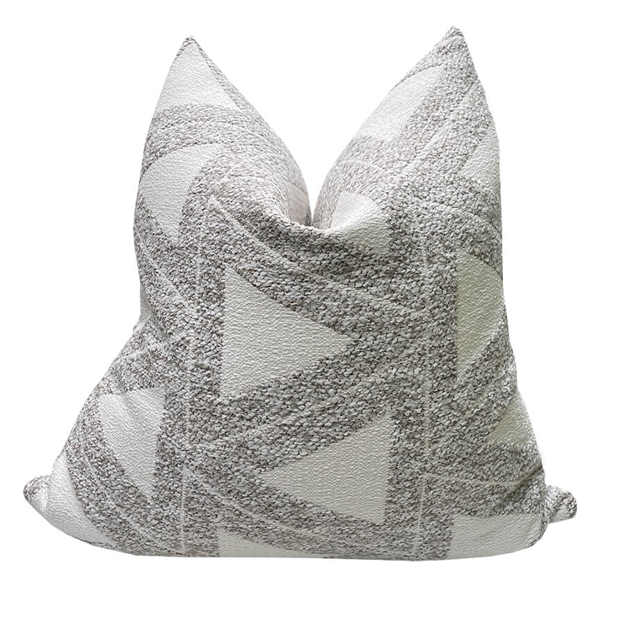 Este cojín es una pieza elegante y versátil que aportará una textura rica y un patrón geométrico moderno a cualquier rincón de tu hogar. Su diseño de triángulos entrelazados en tonos beige, gris claro y marfil es fácil de integrar en decoraciones contemporáneas o minimalistas.