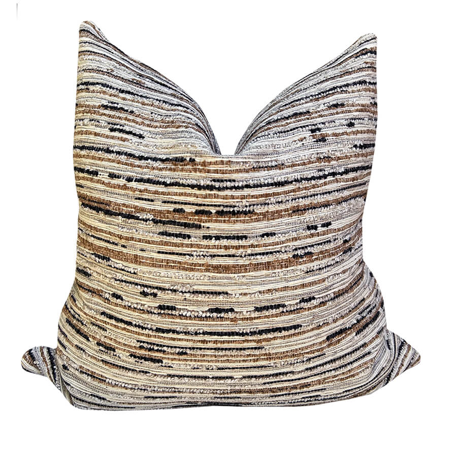 Este cojín es una pieza cautivadora y de tacto supersuave que añade una riqueza visual y táctil instantánea a cualquier espacio. Su diseño a rayas horizontales en tonos beige, marfil, marrón y negro, aportando un estilo rústico, moderno y bohemio a la vez.