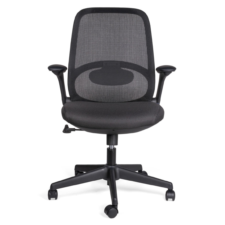 Tapiz: respaldo de malla y asiento tapizado en funda de tela 100% poliéster color negro con pespunte.