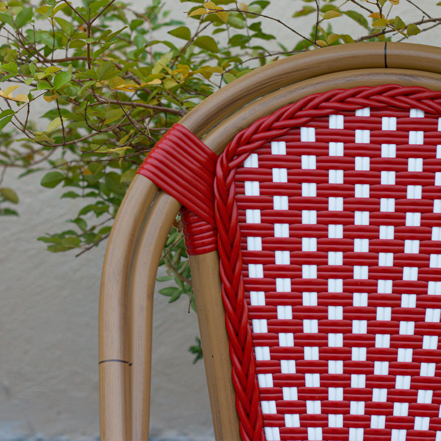 Cuerpo de aluminio con acabado tipo bambú. Respaldo y asiento tejido a mano en ratán sintético rojo y blanco.